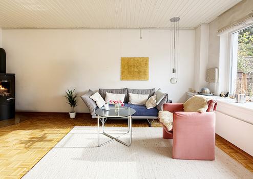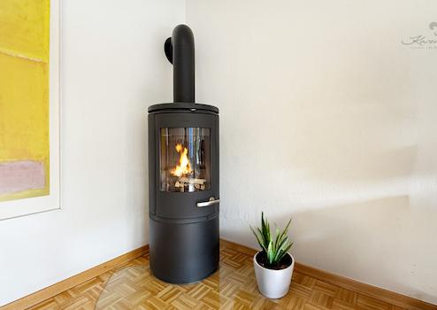 - Wohnzimmer mit Vollholzparkett und Kaminofen