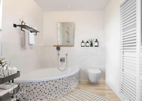 Das Erdgeschoss beherbergt zudem ein modernes Badezimmer mit einer eleganten Badewanne und stilvollen Armaturen. Ein Schlafzimmer im Erdgeschoss bietet Flexibilität, sei es als Elternschlafzimmer oder als Gästezimmer.