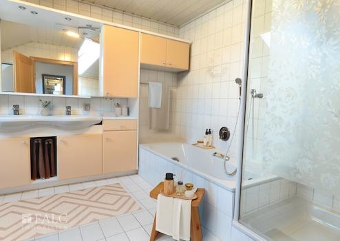Das Badezimmer ist mit einer Badewanne und einer separaten Dusche ausgestattet, was den morgendlichen Ablauf erleichtert. Ein Gäste-WC im Erdgeschoss bietet zusätzlichen Komfort für Besucher.