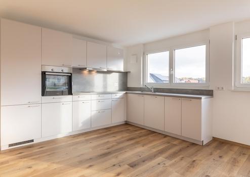 Der offene Wohn- und Essbereich mit integrierter Einbauküche bildet das Herzstück der Wohnung. Die moderne Küche ist mit Marken-Elektrogeräten (Constructa) wie Backofen, Kochfeld, Dunstabzugshaube, Kühlschrank und Spülmaschine ausgestattet und fügt sich harmonisch in das stilvolle Wohnkonzept ein.