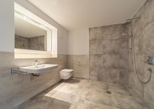 Das innenliegende Badezimmer ist großzügig gestaltet und mit einer bodengleichen Dusche, Waschbecken, WC und einem praktischen Handtuchheizkörper ausgestattet.