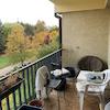 Der überdachte Balkon ist mit Holzbodenbelag versehen und sowohl vom Wohnzimmer als auch vom Schlafzimmer aus begehbar.