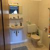 Das Bad mit Wanne sowie das Gäste-WC mit Dusche verfügen über weiße Boden- und hellbeige Wandfliesen.