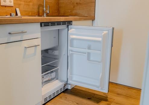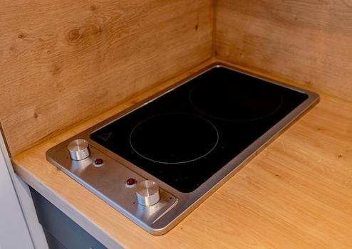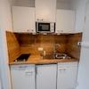 – Neue, moderne Einbauküche mit Kühlschrank, Gefrierfach, Mikrowelle, Cerankochfeld und Edelstahlspüle