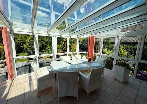 • Verglaster Wintergarten mit Wärmeschutzverglasung, gedämmtes Alupanel und elektrischer Markise