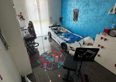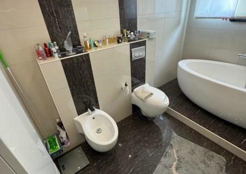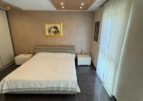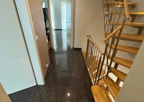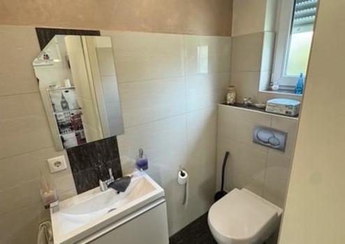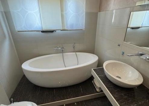 Im Obergeschoss befindet sich auf der rechten Seite das großzügig geschnittene Elternschlafzimmer. Direkt daneben liegt ein weiteres, etwas kleineres Schlafzimmer, das sich ideal als Kinderzimmer eignet. Anschließend folgt das modern ausgestattete Badezimmer mit freistehender Badewanne, Bidet, WC und einem Hygienebereich.