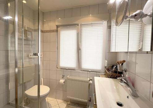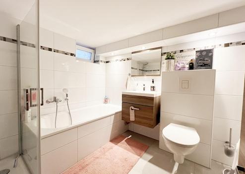 Das Kellergeschoss rundet das Raumangebot ab: Hier befindet sich ein weiteres, sehr großzügiges Badezimmer mit Dusche, Badewanne, WC und Waschtisch, das erst im Jahr 2023 vollständig saniert wurde.