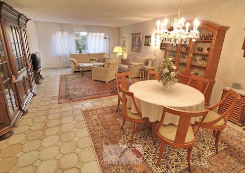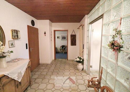 Aufteilung im EG: große Diele - davon durch Glasbausteine und Glastür getrennt ist das helle, 40m² große Wohnzimmer. Von hier gelangt man durch die Terrassentür zum Garten (mit Sondernutzungsrecht, das heißt: alleinige Gartennutzung), außerdem Küche, Badezimmer, Eltern-Schlafzimmer und Kinderzimmer.
