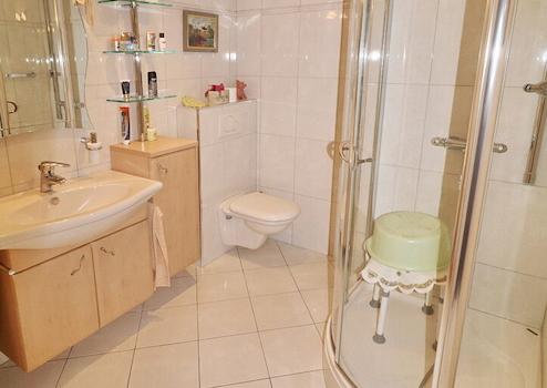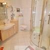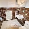 Das innenliegende Badezimmer wurde ca. 2000 erneuert. Die Sanitärelemente (Eckdusche, Toilette und Handwaschbecken) sind weiß, die diagonal verlegten Bodenfliesen und die Wandfliesen hell.