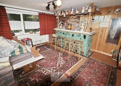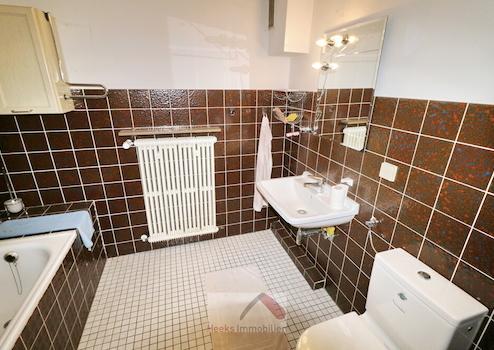 Die Räume im Untergeschoss (kleiner Hobbyraum, Waschkeller, Bad, Partyraum und Werkraum) sind Nutzfläche und nicht in die Wohnfläche eingerechnet. Die Wandfliesen des Badezimmers (mit weißen Sanitärelementen: Badewanne, Toilette und Handwaschbecken) entsprechen dem Baujahr des Hauses.
