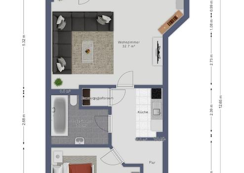 Die zum Verkauf stehende Wohnung verfügt über etwa 55 Quadratmeter Nutzfläche und besteht aus zwei selbstständig nutzbaren Wohnräumen, die über einen gut belichteten Flur mit der offenen Küche, dem Hauswirtschaftsraum und einem geräumigen Wannenbad verbunden sind. Das Badezimmer ist nahezu deckenhoch gefliest. Die Keramikamaturen sind für Wohnungen vergleichbaren Alters entsprechend. Kurzfristig und kostengünstig erreichbare Modernisierungspotenziale bestehen nach unserer Auffassung insbesondere im Bereich des Waschbeckens, das durch ein modernes breites Becken mit integriertem Unterschrank den Gesamteindruck klar steigern würde. Ebenfalls zu prüfen wäre nach unserer Empfehlung der Austausch des Heizkörpers gegen einen komfortablen Handtuchheizkörper.