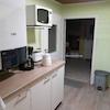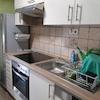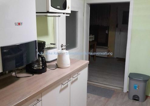 Küche mit Kühl- und Tiefkühlschrank, Mikrowelle, Kaffeemaschine, Wasserkocher, Geschirr, Besteck, Gläsern, Töpfen, Pfannen, etc., Induktionsherd.