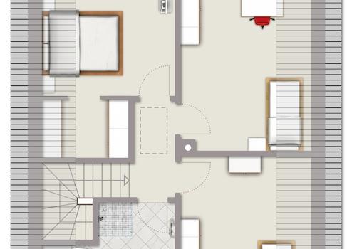 Das Haus verfügt über eine Terrasse, die zum Entspannen und Genießen des Außenbereichs einlädt. Insgesamt bietet das Haus 4 Zimmer, eins davon mit einem begehbarem Kleiderschrank, sowie zwei Tageslichtbäder.