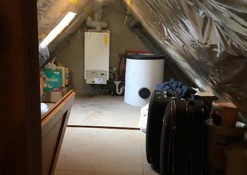 Die Warmwasseraufbereitung und Wärmeversorgung erfolgt über eine Gastherme, welche im Spitzboden verbaut ist. Es erfolgt eine jährliche Wartung.