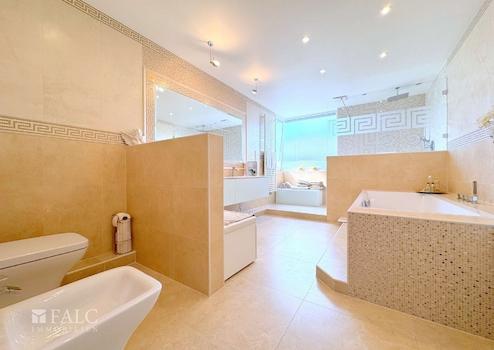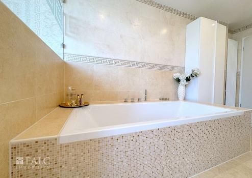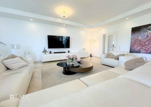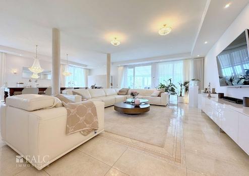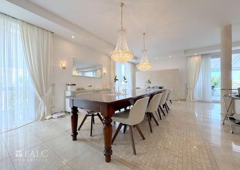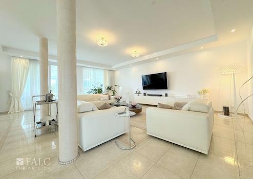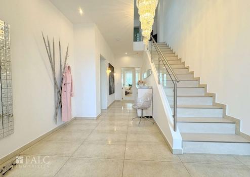Die Hauptwohnung mit ca. 370 m² Wohnfläche erstreckt sich über Erd- und Obergeschoss und besticht durch ein durchdachtes Raumkonzept sowie exklusive Ausstattung. Hochwertige Fliesen in nahezu allen Bereichen – teilweise edelste Materialien aus Italien – verleihen der Wohnung ein elegantes, modernes Ambiente.