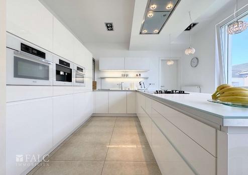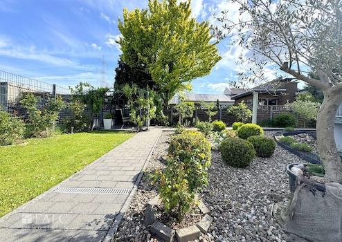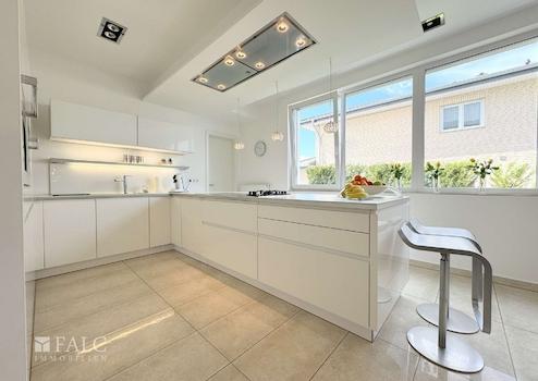 Was die Energieeffizienz betrifft, so ist das Haus mit einer hochwertigen 3-fach verglasten Fensterfront ausgestattet, die für eine hervorragende Dämmung sorgt. Die Photovoltaikanlage auf dem Dach hat eine Leistung von 5,7 kWp und ermöglicht die Eigenproduktion von Strom. Durch die Einspeisevergütung trägt sie zusätzlich zur Wirtschaftlichkeit bei. Ergänzt wird das System durch Solarthermie, die die Warmwasserbereitung unterstützt. Diese nachhaltigen Maßnahmen reduzieren die Energiekosten erheblich und machen das Haus zukunftssicher und umweltfreundlich.