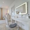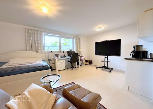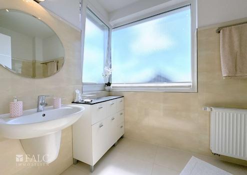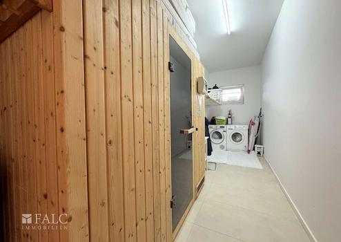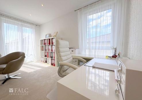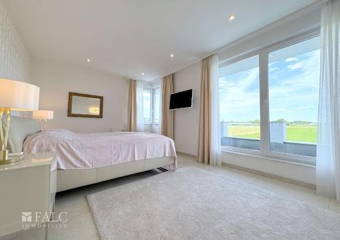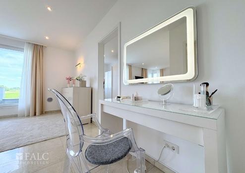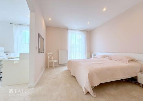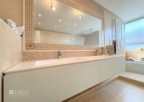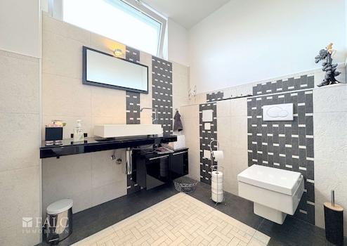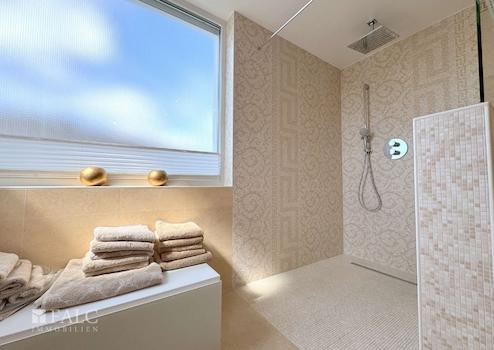 Im Obergeschoss befindet sich das großzügige Hauptschlafzimmer mit direktem Zugang zu einem stilvollen Wellness-Badezimmer sowie einem begehbaren Kleiderschrank – ein exklusiver Rückzugsort mit viel Privatsphäre. Insgesamt verfügt die Hauptwohnung über drei voll ausgestattete Badezimmer und zwei Gäste-WC´s, die den Wohnkomfort zusätzlich unterstreichen.