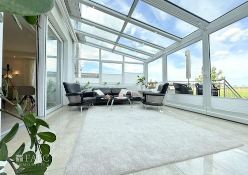 Im Erdgeschoss erwartet Sie ein großzügiger, lichtdurchfluteter Wohn- und Essbereich mit Kaminofen, eine moderne Einbauküche sowie ein eleganter Wintergarten mit Klimaanlage und Beschattung, der ganzjährig als erweiterter Wohnraum dient. Von hier gelangen Sie in den traumhaften Wintergarten mit traumhafter Fernsicht. Ein Gäste-WC ergänzt den Wohnkomfort auf dieser Ebene.