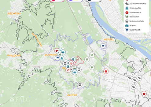 Die Region Bornheim zeichnet sich durch eine ausgewogene Mischung aus städtischem Komfort und naturnaher Umgebung aus, was sie zu einem idealen Wohnort für verschiedene Lebensstile macht. Der nächste Flughafen, Köln/Bonn, ist in etwa 25 Kilometern erreichbar, was die Lage auch für Vielreisende attraktiv macht.