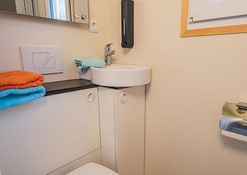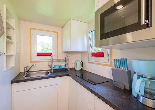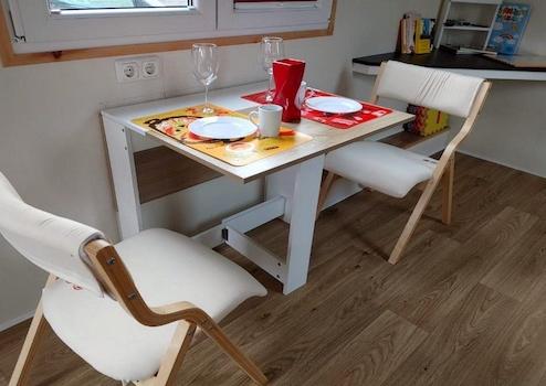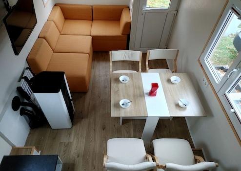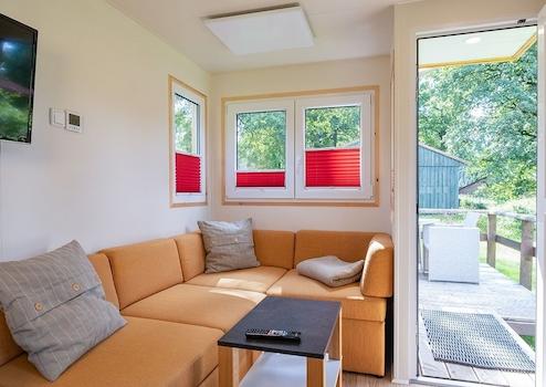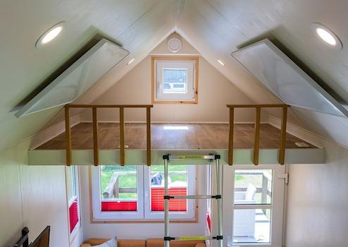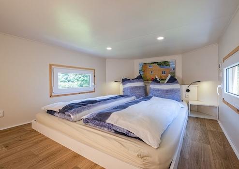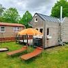 Das ganzjährig nutzbare Tiny House verfügt über ein Schlafloft, ein Eingangsloft, eine voll eingerichtete Küche, ein Bad mit Dusche sowie den Wohnbereich, Schreibtisch, Esstisch und schwenkbarem Fernseher. Die große ...