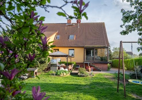 Das Grundstück umfasst ca. 1.200 m² mit einem geschützten Gartenbereich hinter dem Haus – ideal für Familien, Gäste oder entspannte Stunden im Grünen.