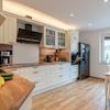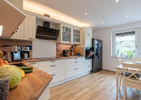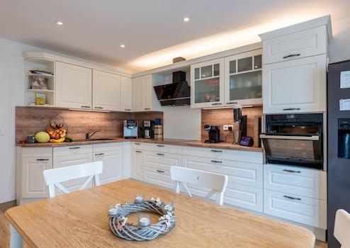 Der Mittelpunkt des Wohnbereichs ist die moderne Einbauküche mit Neff-Einbauherd (2021) und großem Side-by-Side Kühlschrank, direkt angrenzend an den beheizten Wintergarten, der zu jeder Jahreszeit als erweiterter Wohnraum genutzt werden kann.
