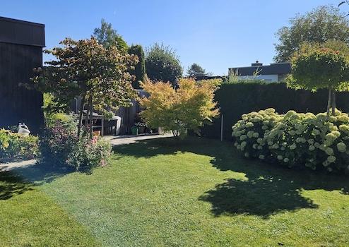 Der wunderschöne und pflegeleicht angelegte Garten bietet Rückzugsmöglichkeiten zur Entspannung sowie ausreichend Platz zum Grillen und Spielen. Der Garten ist ganztägig sonnig. Die im Süden liegende Hauptterrasse ist teilweise überdacht und mit einer Markise beschattet. Die im Nordwesten gelegene Terrasse fängt die Abendsonne ein.