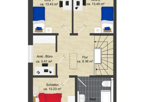 Im Obergeschoss erwartet Sie ein großzügiger Rückzugsbereich. Das moderne Badezimmer ist hochwertig ausgestattet und verfügt über eine Badewanne, eine bodengleiche Dusche sowie zwei separate Waschbecken, die besonders in den Morgenstunden Komfort und Flexibilität bieten. So können mehrere Familienmitglieder das Bad gleichzeitig nutzen. Das Hauptschlafzimmer bietet ausreichend Platz für einen großen Kleiderschrank und sorgt für erholsame Nächte. Zwei weitere Zimmer lassen sich flexibel als Kinder-, Gäste- oder Arbeitszimmer nutzen und bieten viel Helligkeit sowie Gestaltungsspielraum. Ein weiter kleiner Raum kann individuell als kleines Büro oder Ankleide genutzt werden.