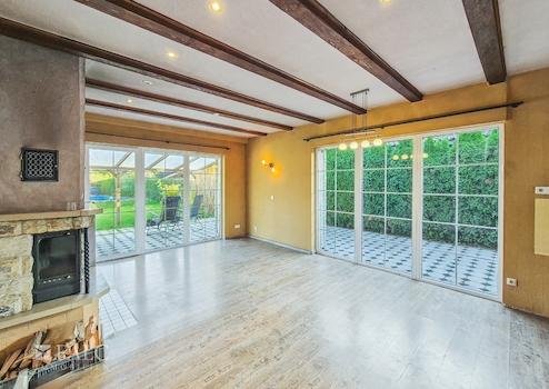 Beim Betreten dieses charmanten Bungalows werden Sie von einem einladenden Eingangsbereich empfangen, der ausreichend Platz für eine Garderobe bietet. Von hier aus gelangen Sie direkt in das geräumige Wohnzimmer, das durch große Fensterfronten mit Tageslicht durchflutet wird und einen herrlichen Blick auf die Terrasse und den Garten bietet. Ein Kamin sorgt für wohltuende Wärme und entspannte Abende.