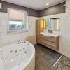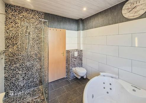 Das Badezimmer ist funktional und stilvoll gestaltet, ausgestattet mit einer Badewanne und einer separaten Dusche. Hochwertige Armaturen und dezente Fliesen sorgen für ein modernes Ambiente. Ein Gästebad und der Hauswirtschaftsraum befinden sich ebenfalls in dieser Etage.
