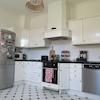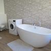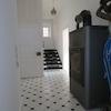 Die Bodenbeläge im EG bestehen in der Küche, dem Vorratsraum, Flur und Gäste-WC aus authentischen Fliesen in Weiß/Schwarz, im Wohnzimmer, Esszimmer, zweitem Eingang und Bad aus Holzdielen. Wobei im Bad diese mit einem Vinyl-Designer-Boden überlegt wurden um den Holzboden vor Feuchtigkeit zu schützen.