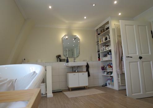 Die Bodenbeläge im Obergeschoss sind durchweg Dielenböden, wobei im Bad auch wieder ein Vinyl-Designer-Boden zum Schutz des Holzbodens eingebracht wurde.