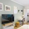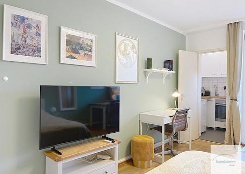 Der Wohn/Schlafbereich ist mit einem Einzelbett und kleiner Essecke ausgestattet. Flatscreen-TV. Von hier aus Zugang zum schönen Balkon. Seperate, voll ausgestattete Küche.