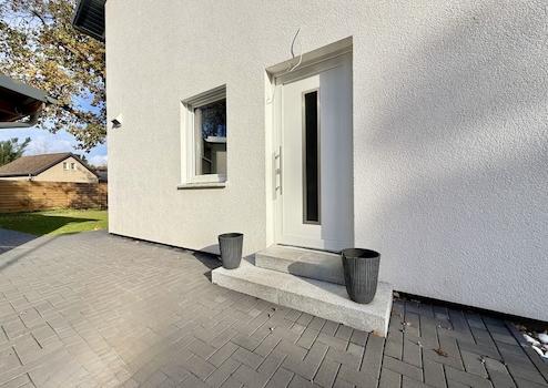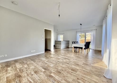 Der offene Wohn- und Essbereich mit angrenzender Terrasse bildet das Herzstück des Hauses. Große Fensterflächen schaffen eine angenehme Verbindung zwischen Innen- und Außenbereich und sorgen den ganzen Tag über für viel Licht. Die moderne Wärmepumpen-Technik, eine zentrale Lüftungsanlage sowie 3-fach verglaste Fenster mit Wärmeschutz sorgen für ein energieeffizientes und komfortables Wohnklima.