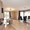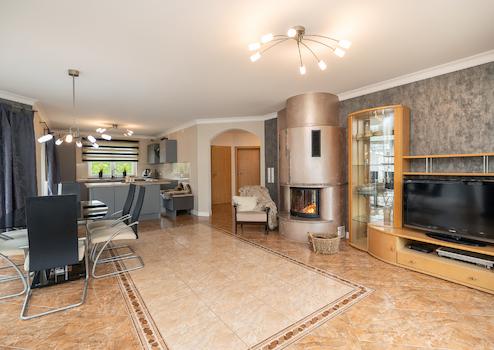 Das helle Wohnzimmer mit Kamin bildet zusammen mit der offenen Küche und dem Essbereich das Herzstück des Hauses. Hier können Sie und Ihre Familie den Tag bei einem gemeinsamen Abendessen und gemütlichen Momenten am Kamin ausklingen lassen. Die bodentiefe Fenster öffnen den Blick in den Garten und schaffen eine harmonische Verbindung zwischen Innen und Außen.