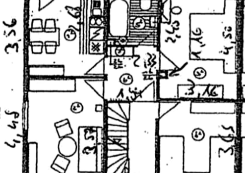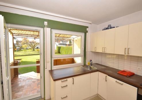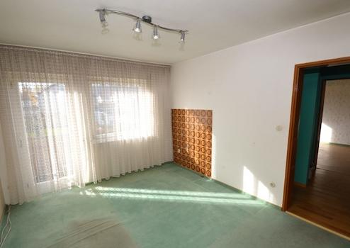 Über die Eingangstüre gelangt man ins Treppenhaus. Dieses verbindet alle Stockwerke miteinander. Die Wohnung im EG verfügt über 3 Zimmer, Küche und Bad. Die Küche hat einen Ausgang auf die Terrasse mit schönem Blick ins Grüne. Der Garten befindet sich in Süd-West-Lage.
