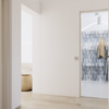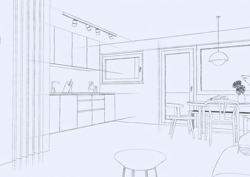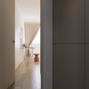 Der offen gestaltete Wohn- und Essbereich bildet das Herz der Wohnung. Die Entfernung der Trennwand zwischen Küche und Wohnraum hat eine großzügige, lichtdurchflutete Raumwirkung geschaffen. Dezente Lamellen zonieren den Bereich subtil, ohne den fließenden Charakter zu unterbrechen. Der hochwertige Eichenparkettboden mit feiner, natursortierter Struktur verleiht dem Interieur eine warme, handwerkliche Note und fügt sich perfekt in das minimalistische Gestaltungskonzept ein.