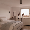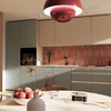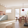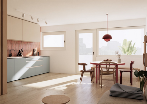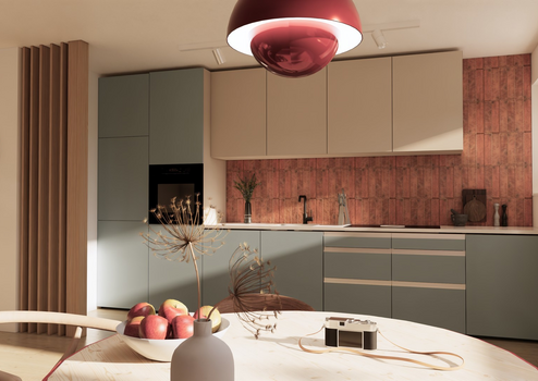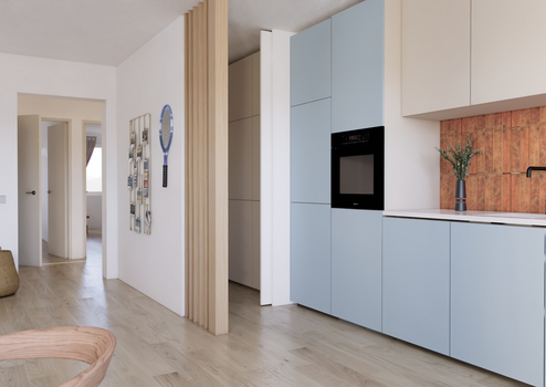 Die Küche folgt dem Stil des Mid-Century-Modern-Revival: klare Linien, ruhiges Pastellblau und handgefertigte, braunrote Fliesen setzen ausdrucksstarke Akzente. Hochwertige Einbaugeräte – darunter Kochfeld mit integriertem Abzug, Backofen, Geschirrspüler, Kühl-Gefrier-Kombination und Waschmaschine – sind präzise in das Design integriert. Angrenzend befindet sich ein Abstellraum mit maßgefertigtem Schranksystem und vorbereitetem Waschmaschinenanschluss, sodass der Wohnbereich frei von technischen Einflüssen bleibt.