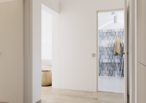 Das Badezimmer präsentiert sich in einer ruhigen Farbwelt aus sanftem Meeresblau und hellen Akzenten. Japanisch inspirierte, längliche Fliesen verleihen der Oberfläche eine feine Textur, während die bodengleiche Dusche mit Glasabtrennung das klare, funktionale Design unterstreicht – ein Raum, der Ruhe und Eleganz ausstrahlt.