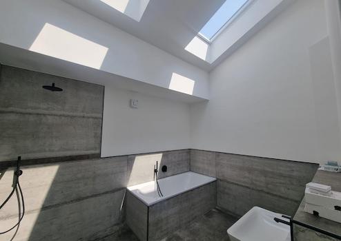 Über die moderne, extrabreite Natursteintreppe erreichen Sie das Obergeschoss. Auf der rechten Seite befindet sich ein außergewöhnliches lichtdurchflutetes Badezimmer. Hier finden Sie eine Badewanne sowie eine große begehbare Dusche (1 m x 1,4 m). Des weiteren gibt es drei Schlafzimmer. Vom Flur aus gelangt man über eine hochwertige Einschubtreppe auf den Speicher, welcher sehr viel Stauraum bietet.