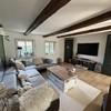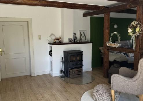 An der Giebelseite Richtung Westen liegt das große, gemütliche Wohnzimmer mit Ofen.