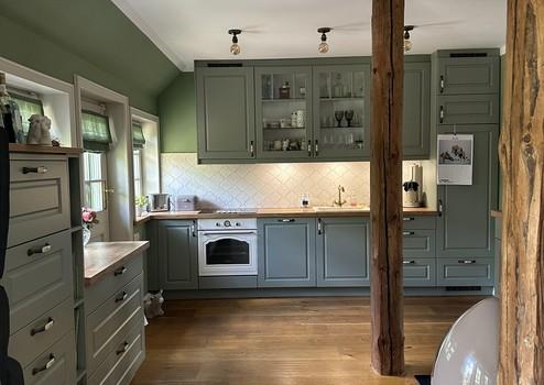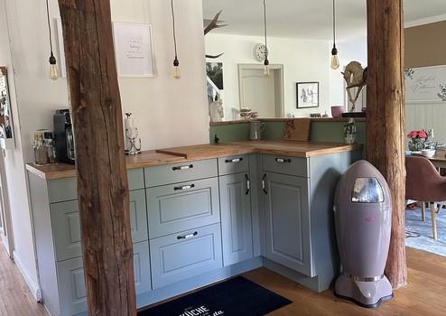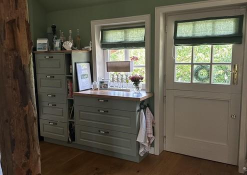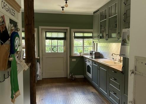 Die lindgrüne Landhauseinbauküche wurde 2018 neu eingebaut und bietet sehr viel Stauraum.