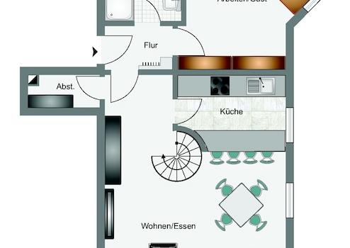 Ein gepflegtes Wohnhaus mit insgesamt nur 6 Wohnungen und ruhigen, überwiegend langjährigen Mitbewohnern. Die Maisonettewohnung verläuft über das II. OG und Dachgeschoss. Aufgeteilt in Wohn-/Esszimmer mit offener Küche, großzügiger Südbalkon, Flur, Arbeits-/Kinderzimmer, Duschbad mit WC, eine offene Wendeltreppe führt auf die Galerie mit Platz für einen Arbeitsbereich, Schlafzimmer mit begehbarem Schrank, Bad mit Wanne und WC.