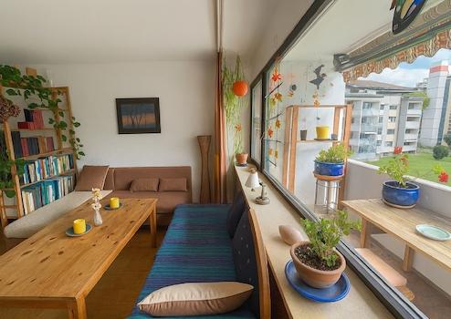 Der Wohnbereich bietet direkten Zugang zur Südwest-Loggia, die Platz zum Entspannen und Genießen der Sonne bietet. Die Küche ist separat und hell, das innenliegende Badezimmer verfügt über eine Badewanne sowie einen Waschmaschinenanschluss.