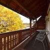 Balkon: Baujahr 1997, Holz, überdacht, Holzgeländer aus gedrechselten Pfosten, gestrichen