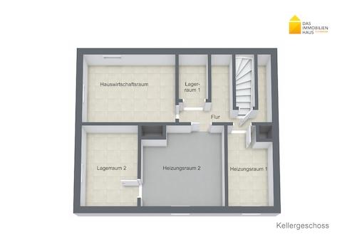 Kellergeschoss: Flur, zwei Lagerräume, zwei Heizungsräume, Hauswirtschaftsraum