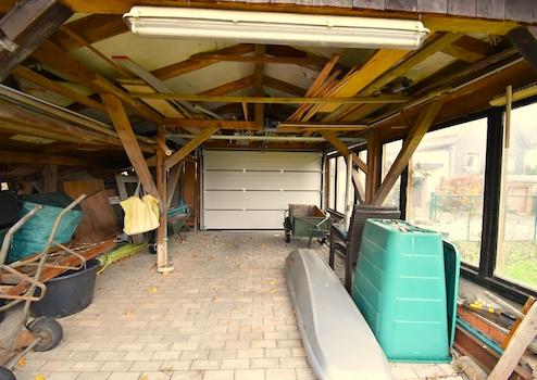 Garage: Baujahr 1979, Massivbau, Satteldach mit engobierten Tondachziegeln (2000), elektrisches Rolltor (2000)