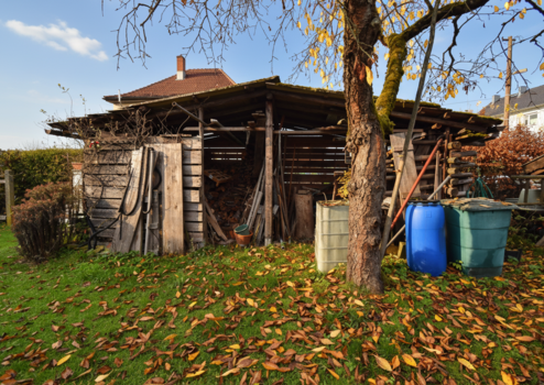 aus Holz, Satteldach mit Wellblech, zur Lagerung von Brennholz
