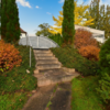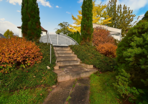 Zugang zum Grundstück mit Granitstufen, zweiseitigem Handlauf, einflügeliges verzinktes Stahltor