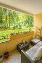 Das großzügige Wohnzimmer bietet Zugang zum überdachten Balkon mit Blick ins Grüne, ein idealer Platz zum Entspannen.